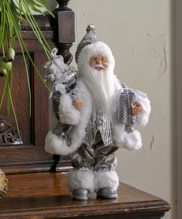 贈り物を大切に抱えた優しい表情のサンタクロースのオブジェは、明るく穏やかなクリスマス演出には欠かせないアイテムです。