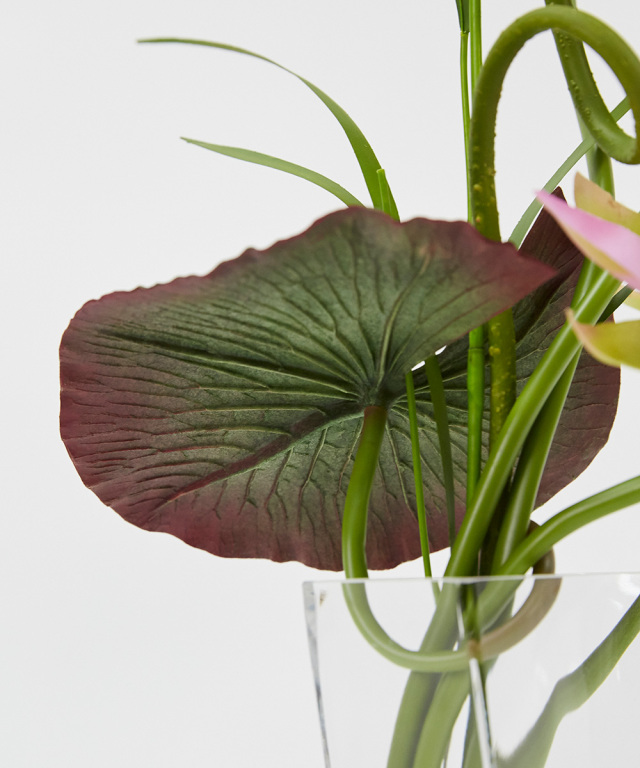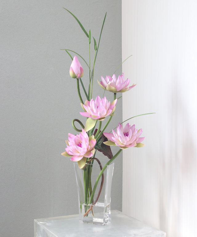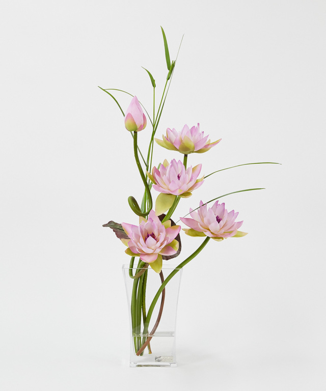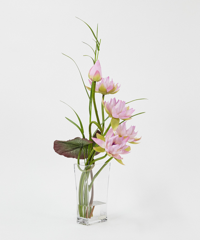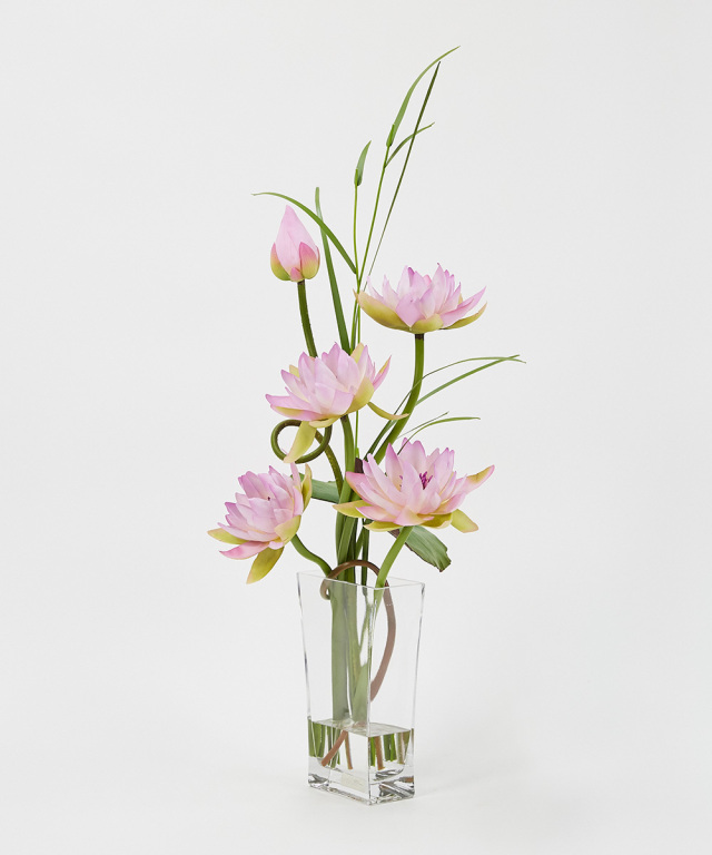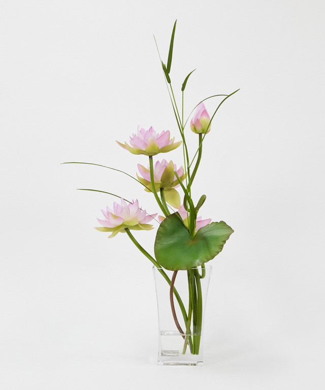 伸びゆく茎の動きをナチュラルに活けたデザインです。神秘的な花“ロータス”の凛とした花姿はスタイリッシュで上質なインテリア空間を演出致します。