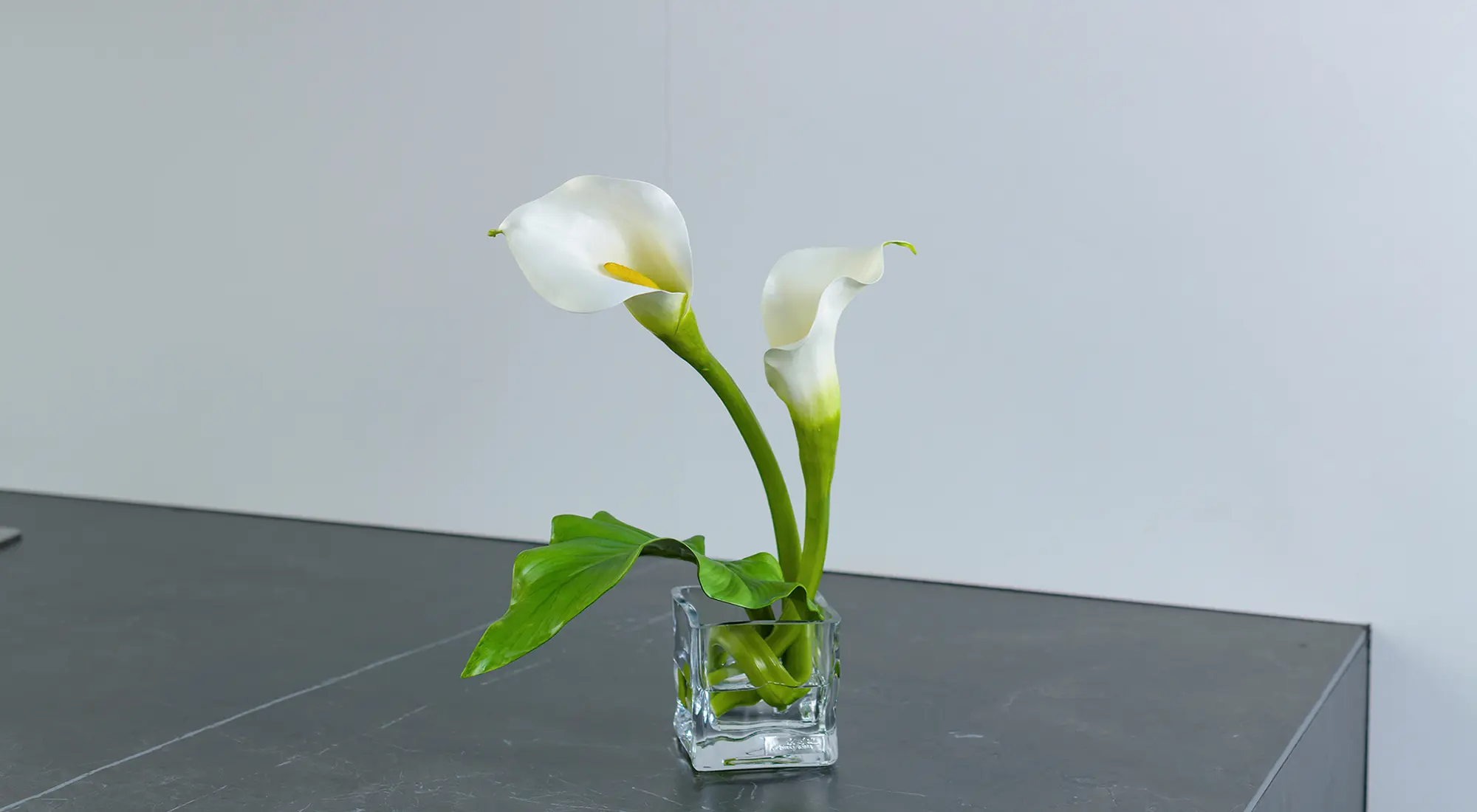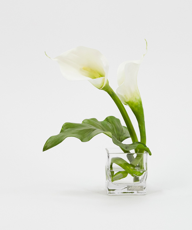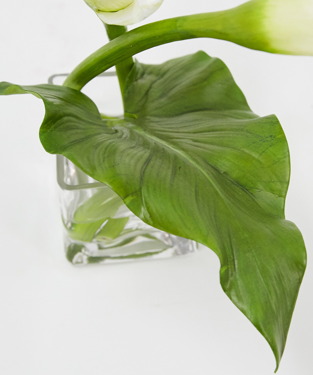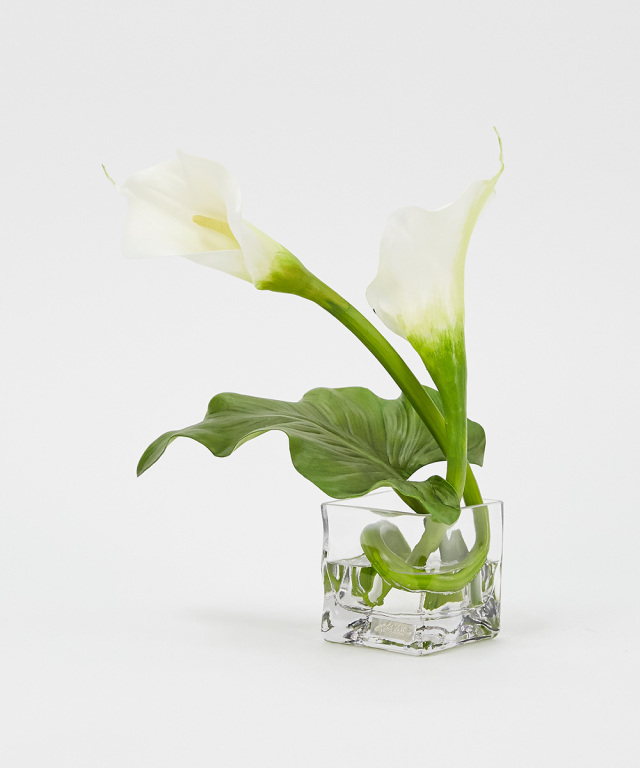 純白で透き通るような花びらは、思わず触ってみたくなるほど瑞々しく、花びらのしわや葉脈までリアルに再現しています。花びらだけでなく、茎や葉にいたるまで造花とは思えないほど精妙に仕上げています。