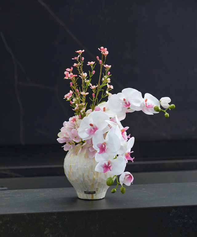 高さのある小花との組み合わせにより、立体感と動きのあるリズムを生み出し、華やかで清楚な雰囲気を空間に添えるアレンジメントです。