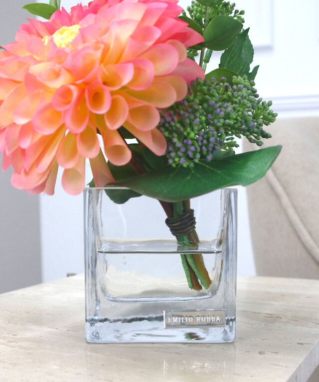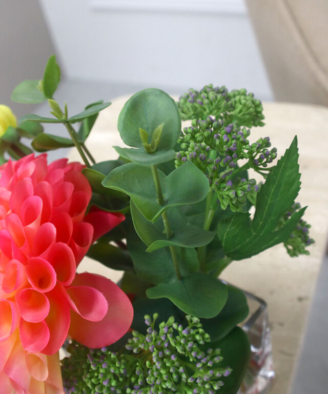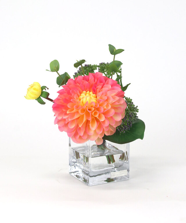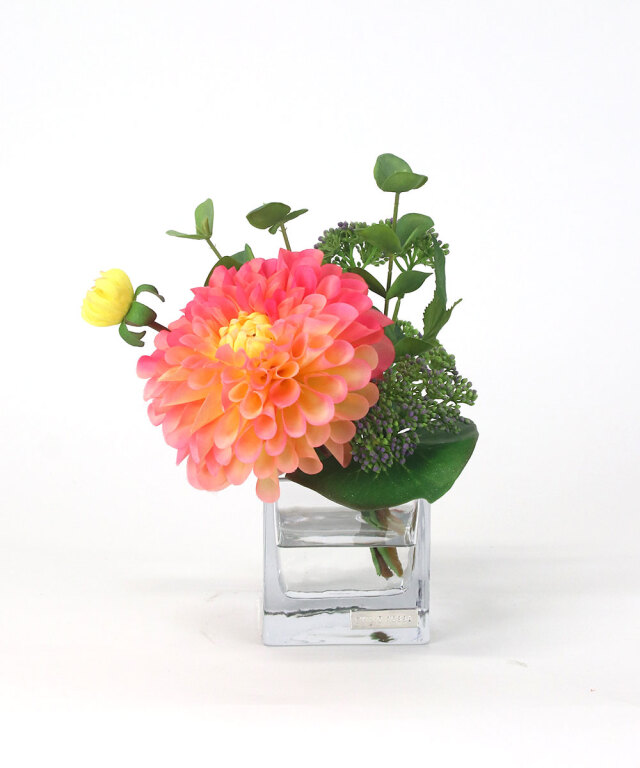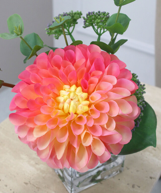 グリーンとのバランスも美しく、飾るだけでインテリアのアクセントになる一品。日常の空間に、華やぎと彩りを添えるダリアデザインです。