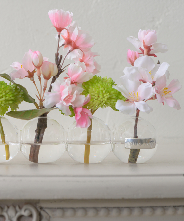 花器の中にはお水に見立てた透明なシリコン樹脂を注ぎ、よりリアルに花の自然な姿を表現しています。 EMILIO ROBBA代名詞でもあるイリュージョンフラワーは、水替え不要で、いつ見ても美しいまま。