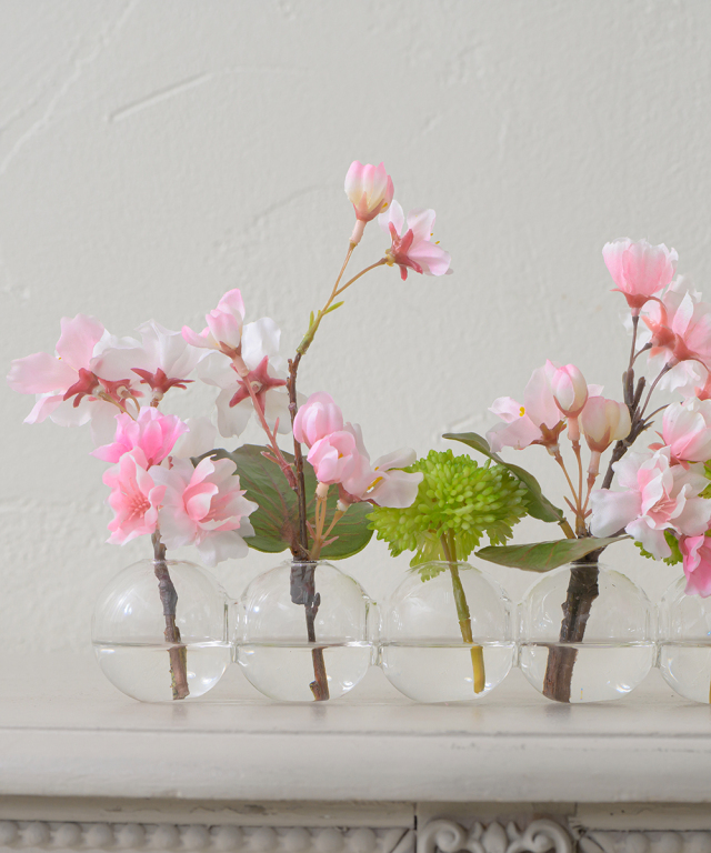 生花では表現しきれない花や葉、茎の動きを自在に描けるのも、アーティフィシャルフラワーならではの魅力。芸術性の高いアレンジメントとして、空間にやさしい春の彩りを添えます。