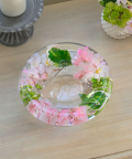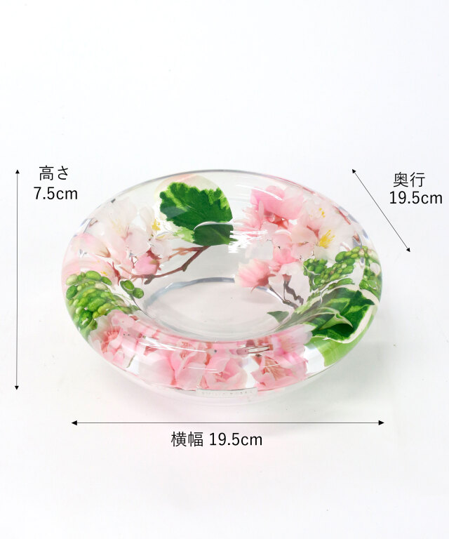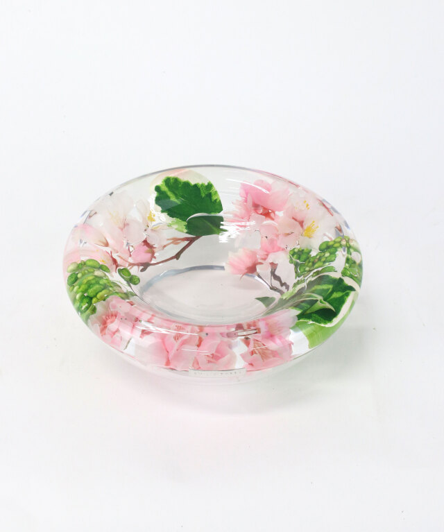 ガラスベースに、水に見立てた透明な樹脂を合わせたイリュージョンフラワーの桜のフラワーボウルデザイン。