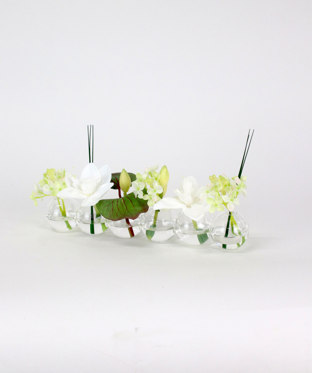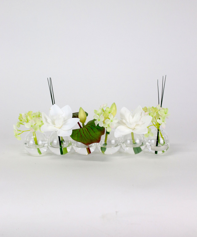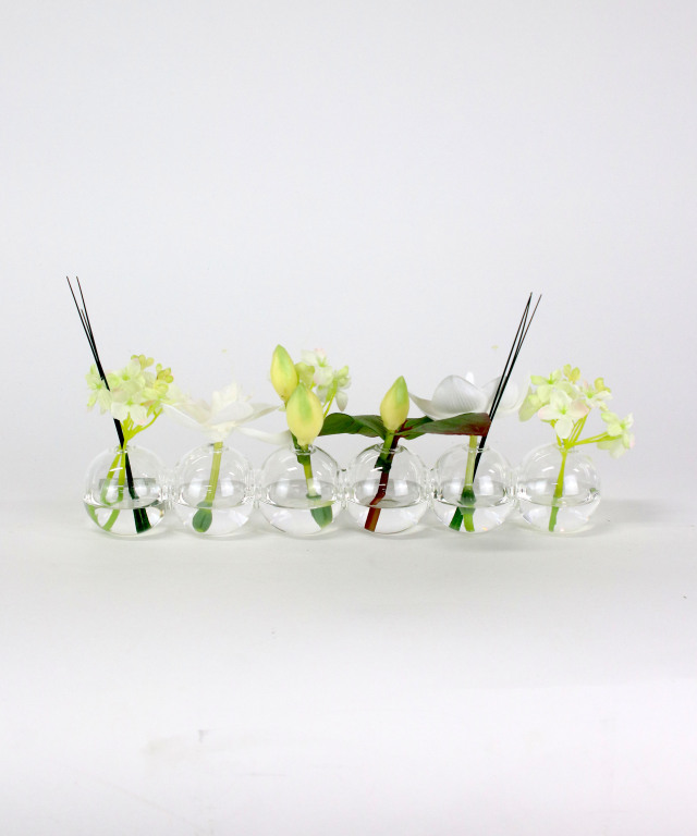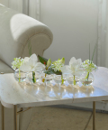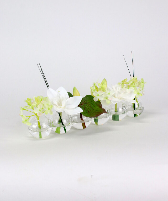 花器の中にはお水に見立てた透明なシリコン樹脂を注ぎ、よりリアルに花の自然な姿を表現しています。 EMILIO ROBBA代名詞でもあるイリュージョンフラワーは、水替え不要で、いつ見ても美しいまま。