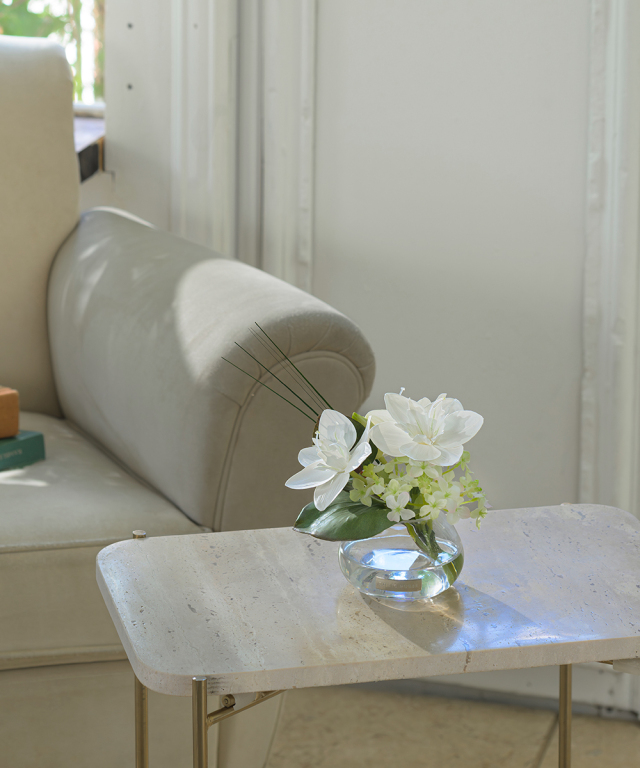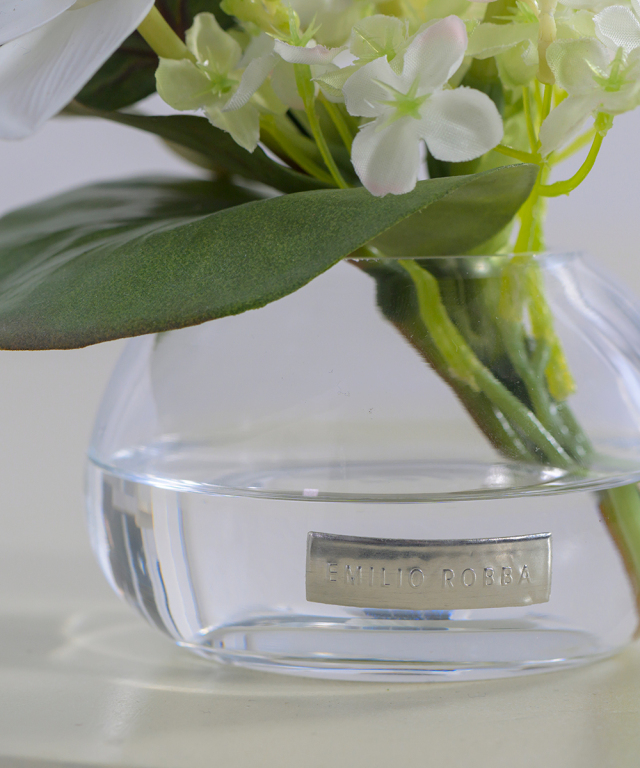 花器の中にはお水に見立てた透明なシリコン樹脂を注ぎ、よりリアルに花の自然な姿を表現しています。 EMILIO ROBBA代名詞でもあるイリュージョンフラワーは、水替え不要で、いつ見ても美しいまま。