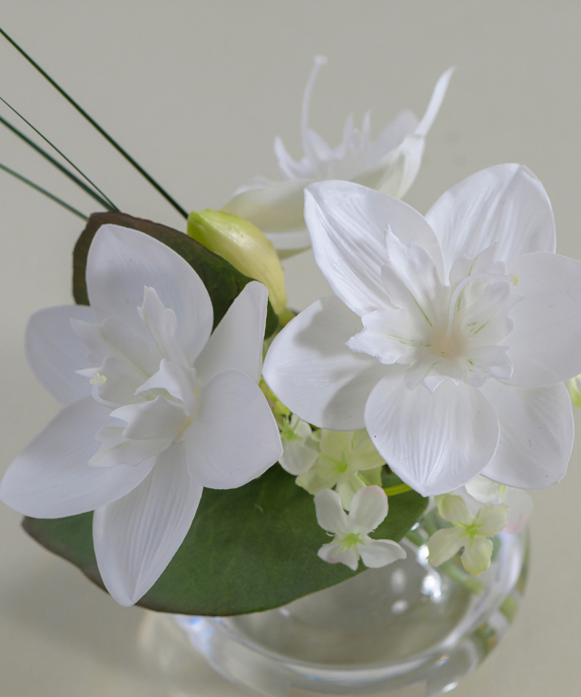 使用花材:ユーチャリス、アジサイ、ベアグラス、プロテアコルダータ