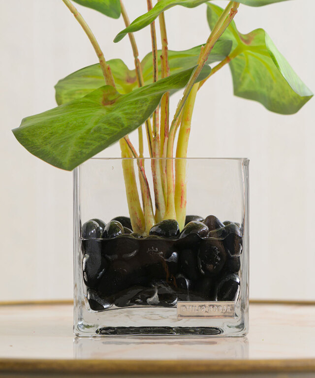 透明感のあるガラス花器と黒石のコントラストが、静かでモダンな印象を際立たせます。