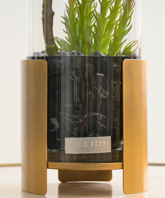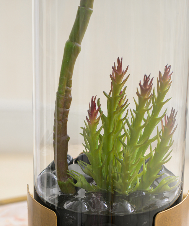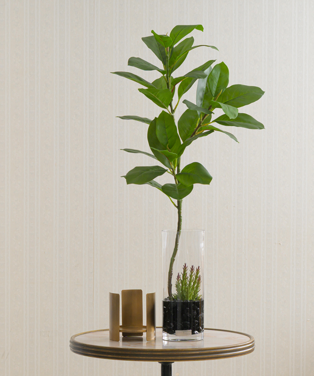 軽やかな枝ぶりが、空間に縦のラインと抜け感を生み出します。 ベースにさりげなく添えた多肉が、遊び心のある粋なアクセントに。
