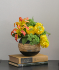 鮮やかなイエローのラナンキュラスと、凛としたグロリオサが咲き誇る華やかなアレンジメント。