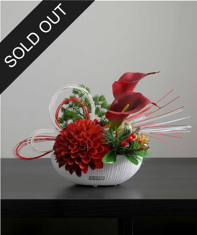深紅のダリアと艶やかなカラーに、松の瑞々しさを添えた華やかなアレンジメント。