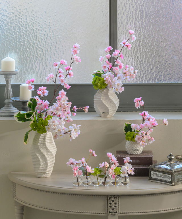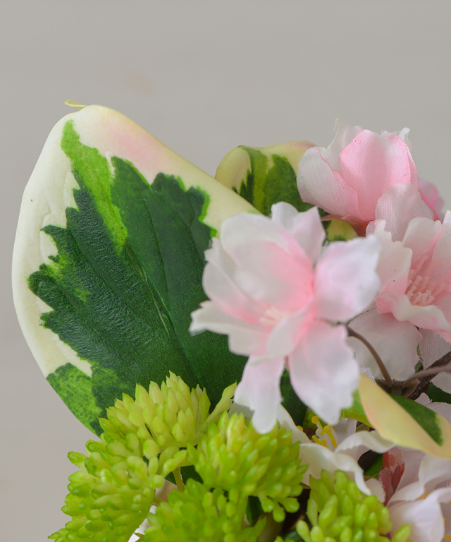 生花では表現しきれない花や葉、茎の動きを自在に描けるのも、アーティフィシャルフラワーならではの魅力。芸術性の高いアレンジメントとして、空間にやさしい春の彩りを添えます。