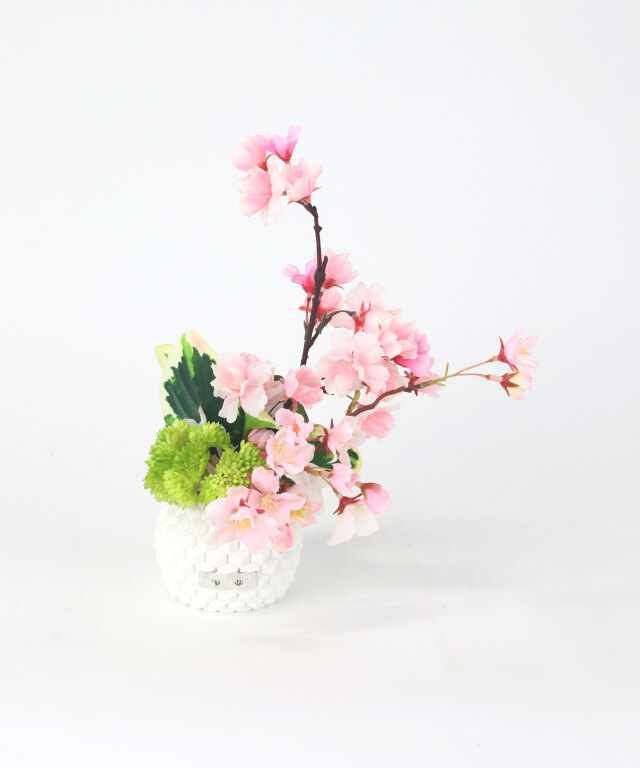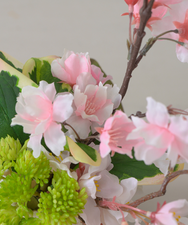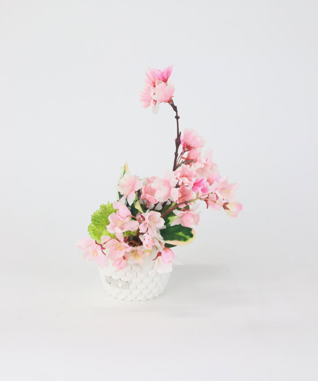 風に揺らぐようなエアリー感が魅力の桜を主役に、伸びゆく枝の美しさをそのまま生かした、ナチュラルな立ち姿のデザイン。